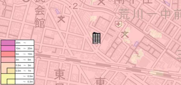 | 【対水害の評価】 [標高・地形] ●標高2m前後、東京東部の低地帯に位置します。 ●隅田川の河岸よりも標高が低い場所です。 〔浸水深〕 ●洪水・内水氾濫により3m~5m未満の浸水可能性が指摘されています。 〔対水害総評〕 ●低地帯に位置し、3m以上の浸水可能性が指摘されているので、浸水リスクは非常に大きいです。 ●想定を超える高潮や大雨が発生した場合には、浸水被害が拡大する可能性のある立地です。 |