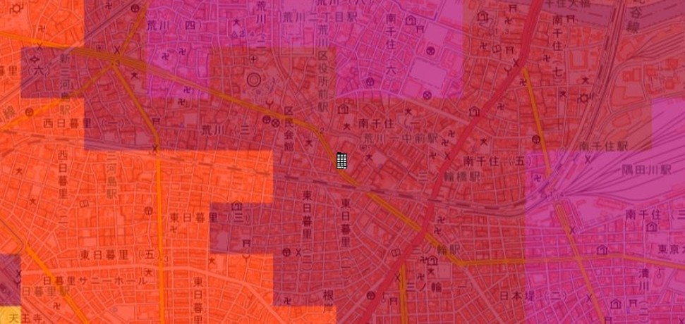 ●東京都の「地震に関する地域危険度測定調査」によると、「荒川1丁目」の地域危険度は“4”(※)であり、災害リスクが大きい地域であるとされています。