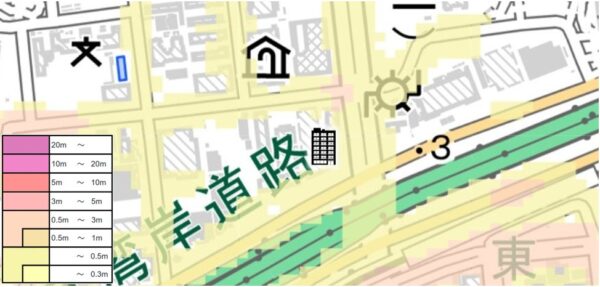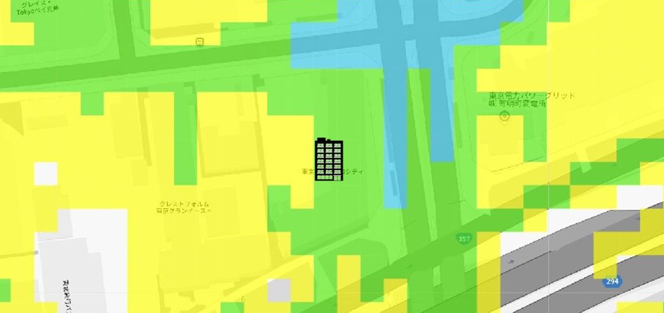| 【対水害の評価】 [標高・地形] ●標高3m前後の湾岸の埋立地に位置します。 〔浸水深〕 ●高潮により約0.9mの浸水可能性が指摘されています。 ●内水氾濫・洪水により0.5m未満の浸水可能性が指摘されています。 〔対水害総評〕 ●湾岸の埋立地に位置し、約0.9mの浸水可能性が指摘されているので、浸水リスクは顕在です。 ●想定を超える高潮や大雨が発生した場合には、浸水被害が拡大する可能性のある立地です。 |