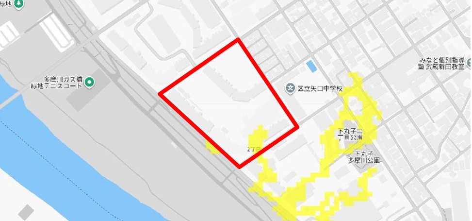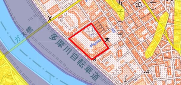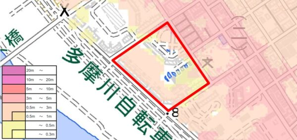 多摩川河岸に位置し、0.5m~3mの浸水可能性が指摘されているので、浸水リスクは顕在です。