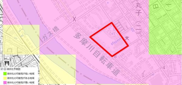 東京都建設局が公開している「東京の液状化予測図」では、「液状化の可能性が高い地域」に該当します。