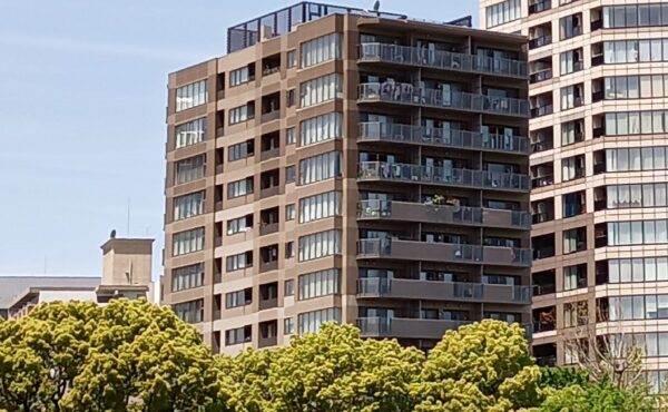 地盤リスクがないとはいえない(が深刻な問題もみられない)場所ですが、シンプルな形状かつ14階程度の高さの建物なので、大きな損壊リスクはないでしょう。