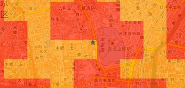 ●東京都の「地震に関する地域危険度測定調査」によると、「池之端1丁目」の地域危険度は“1”(※)であり、災害に強い地域であるとされています。